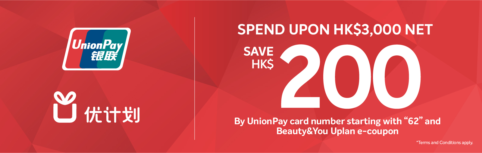 Spend upon HK$3,000 with UnionPay card (card number starting with “62”) to have an instant deduction of HK$200 at Beauty&You stores.