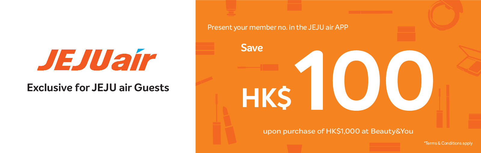 Present your member no. in the JEJU air APP and enjoy HK$100 instant discount upon purchase of HK$1,000 at Beauty&You.