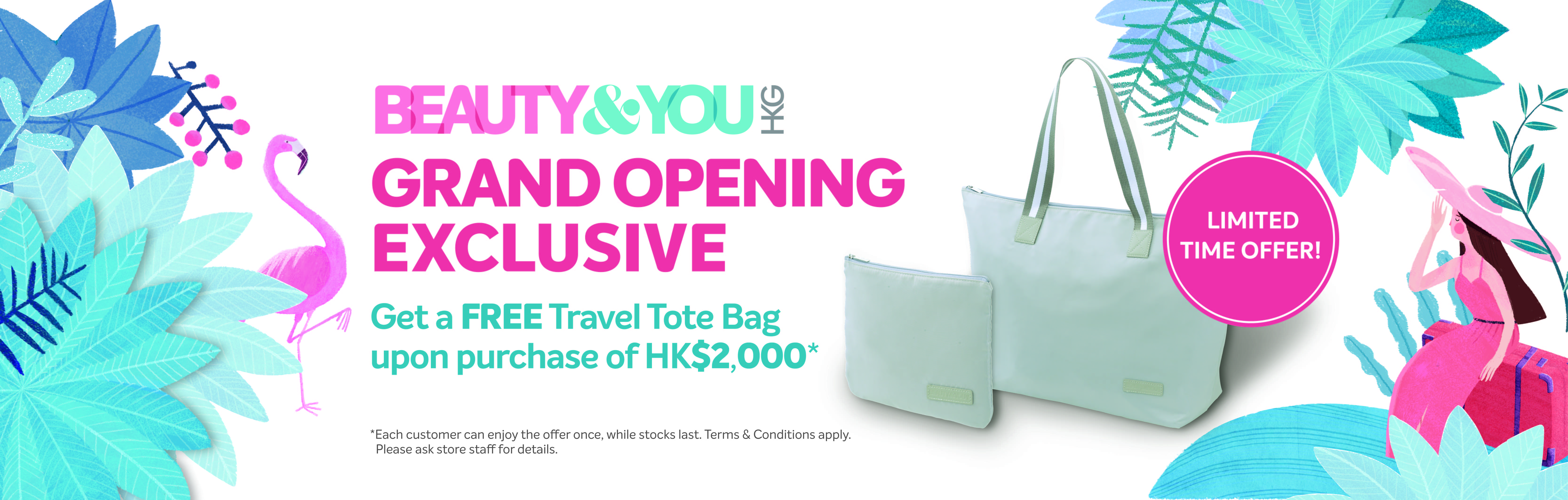 Spending HK$2,000 or more at Beauty&You stores will be rewarded with a Beauty&You Travel Tote Bag.