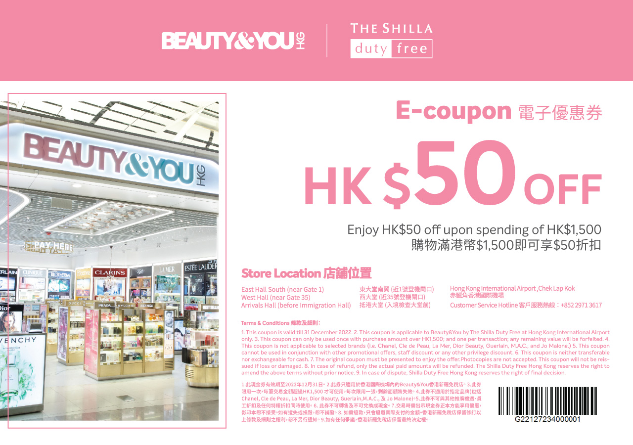 2. The promotion and e-coupon apply to BEAUTY&YOU by The Shilla Duty Free at Hong Kong International Airport only.