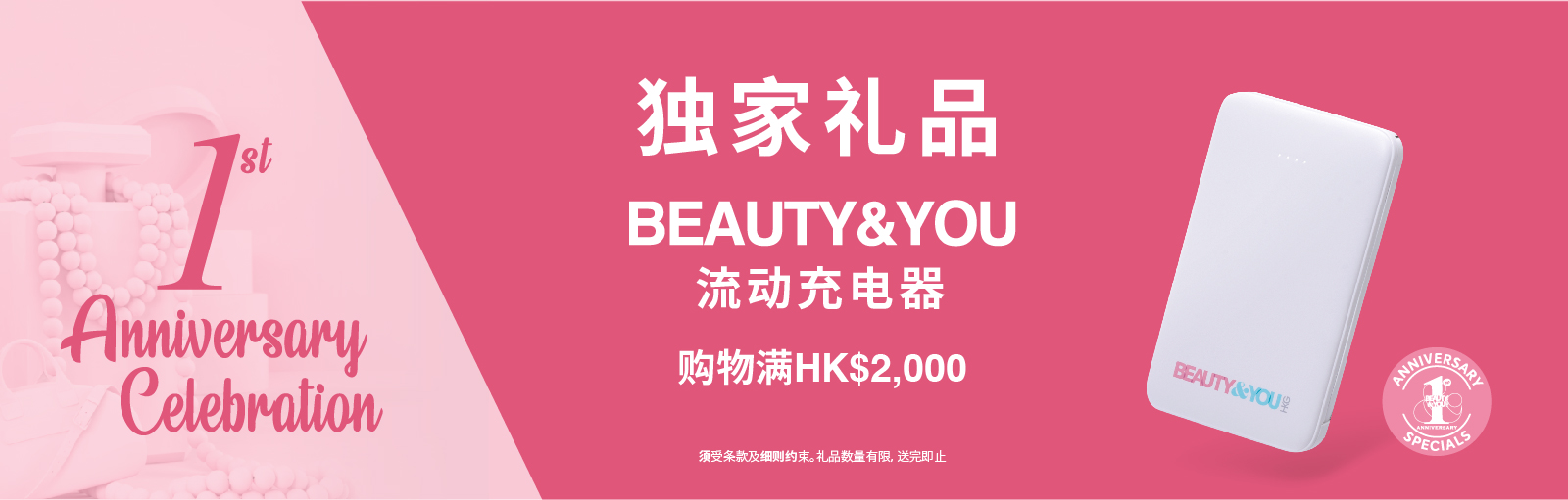 凡购物满HK$2,000, 可获 BEAUTY&YOU独家流动充电器一个。
