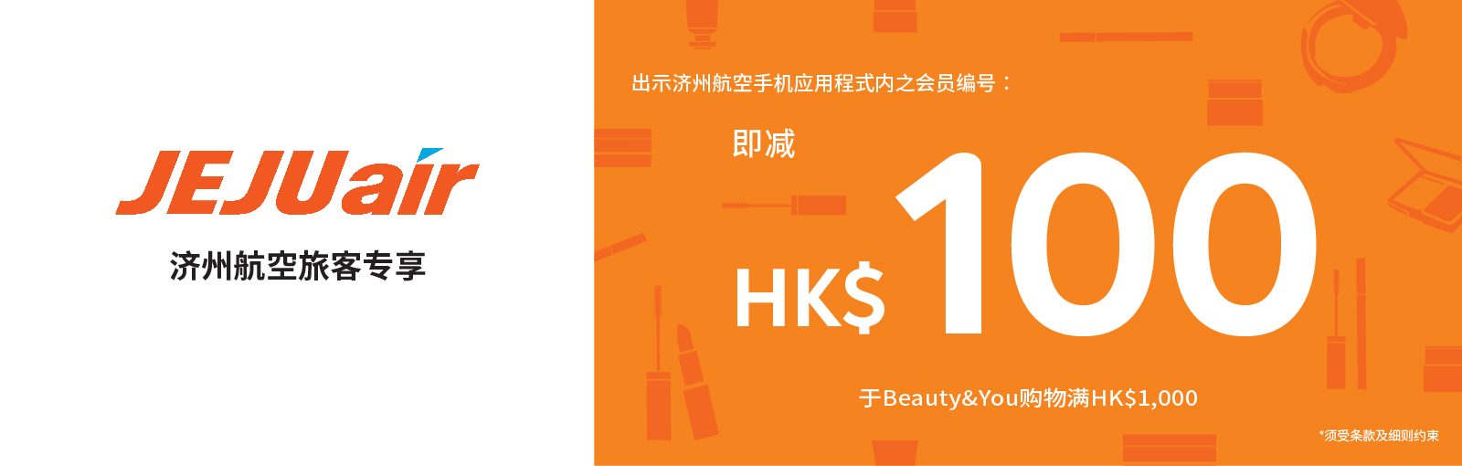 出示济州航空手机应用程序内之会员编号,于Beauty&You购物满HK$1,000,即可享HK$100折扣优惠。