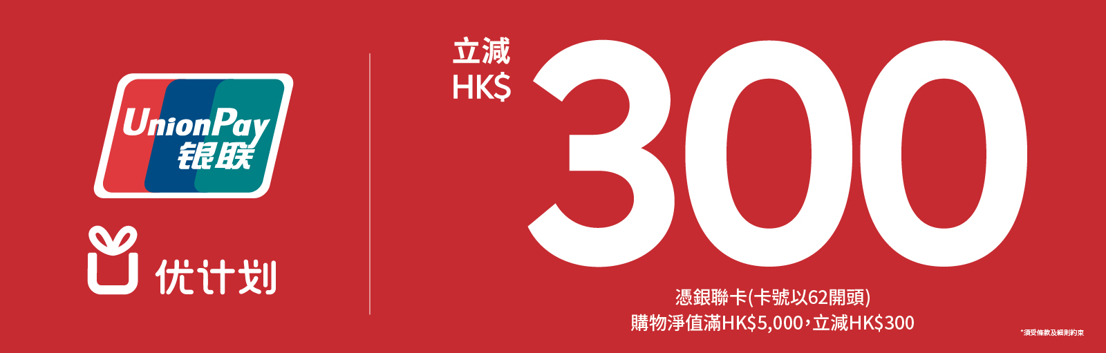凡持銀聯卡(卡號以62開頭),於Beauty&You店內單筆消費滿HK$5,000,即可減HK$300。